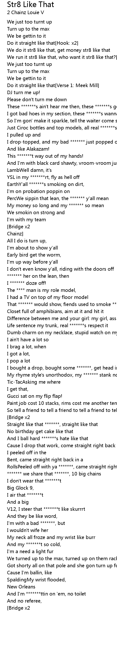 And We turned up, got your ******* tryna *******[Hook x2][Bridge x2][Verse 2: 2 Chainz] |