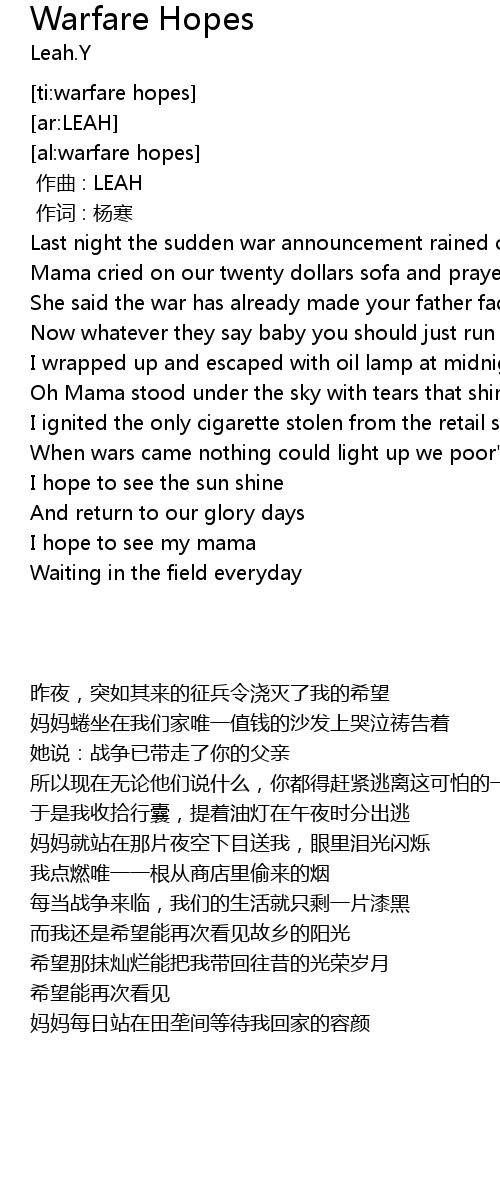 | [01:18.42] | When wars came nothing could light up we poor' s life |