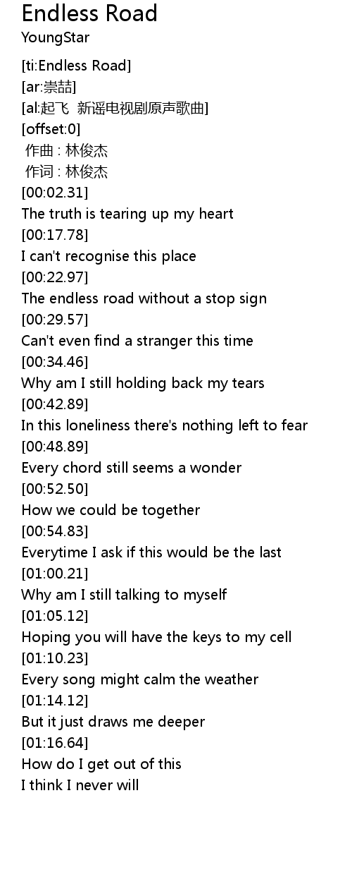 | [00:24.51] | The endless road without a stop sign |