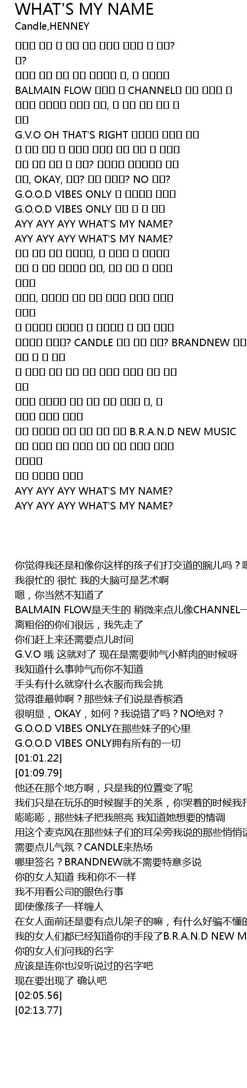 | [01:09.79] | AYY AYY AYY WHAT' S MY NAME? |