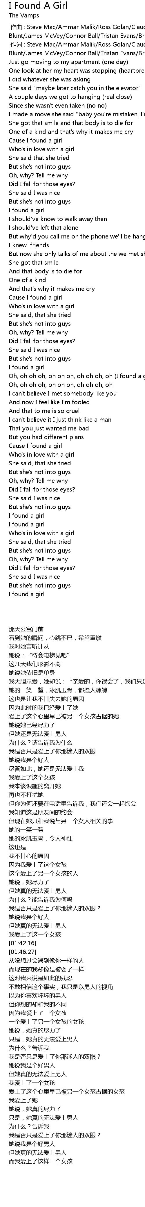| [01:42.16] | Oh, oh oh oh, oh oh oh, oh oh oh, oh I found a girl |