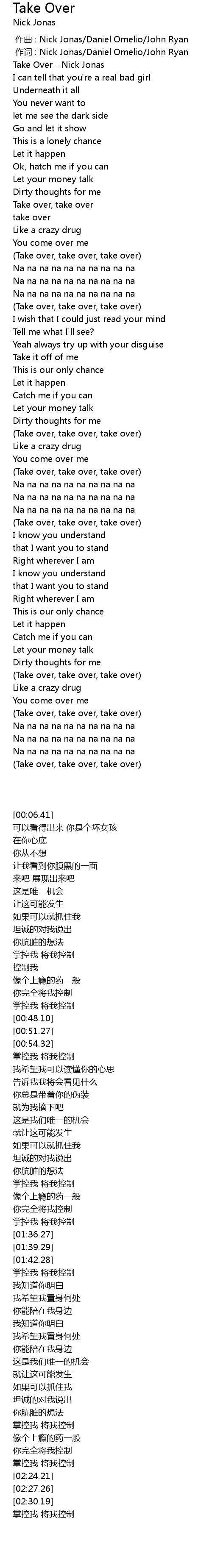 | [00:06.41] | Take Over - Nick Jonas |