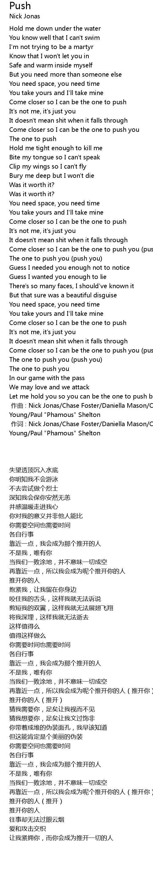 | [00:00.00] | zuò cí : Nick Jonas Chase Foster Daniella Mason Christopher Young Paul " Phamous" Shelton |