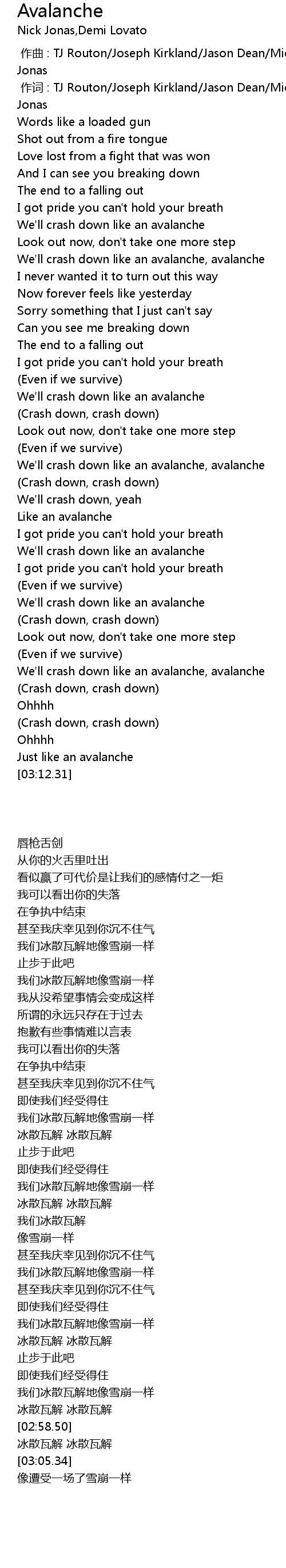 | [00:01.00] | 作词 : TJ Routon/Joseph Kirkland/Jason Dean/Michel Heyaca/Nick Jonas |