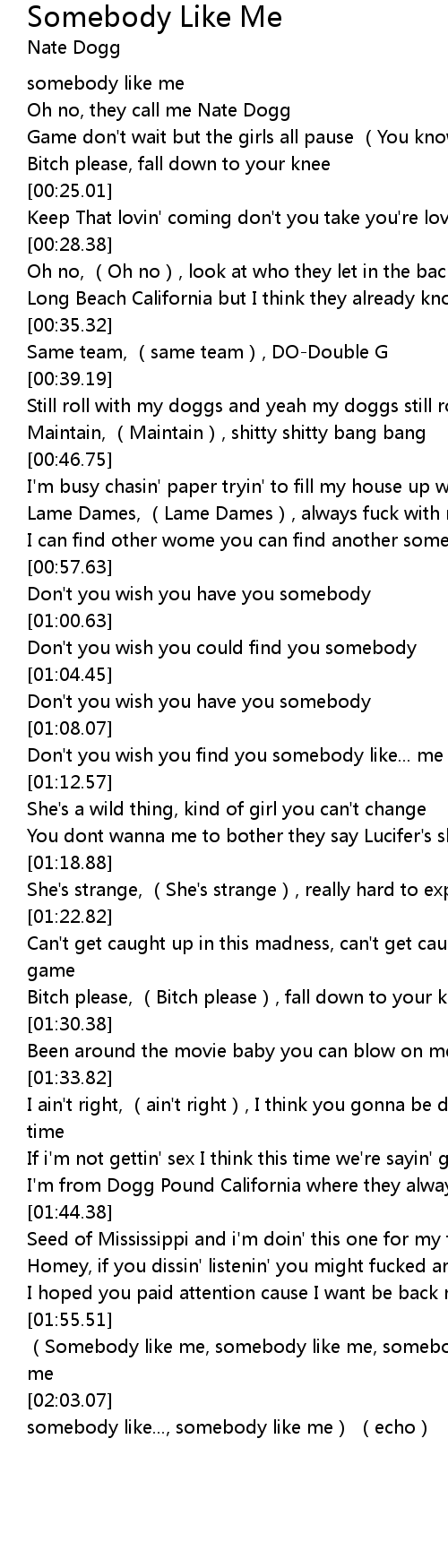 | [00:15.57] | Oh no, they call me Nate Dogg |