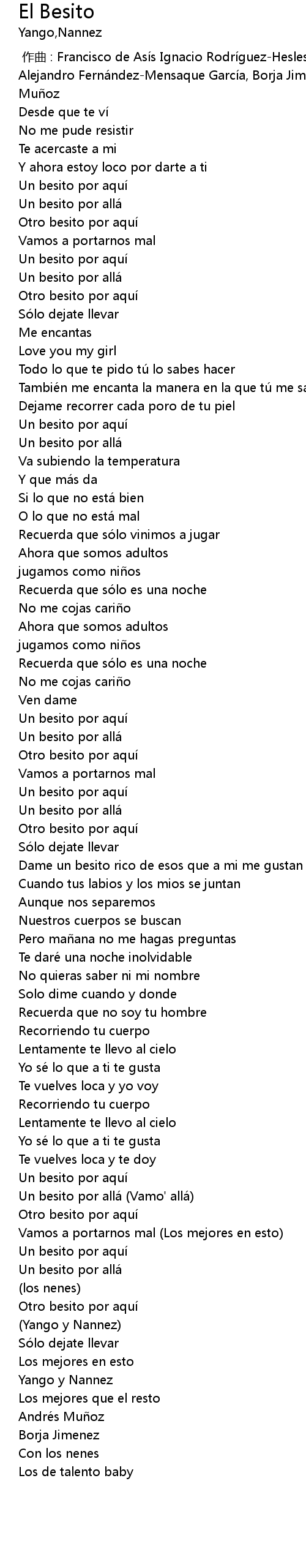 | [01:35.835] | Dame un besito rico de esos que a mi me gustan |