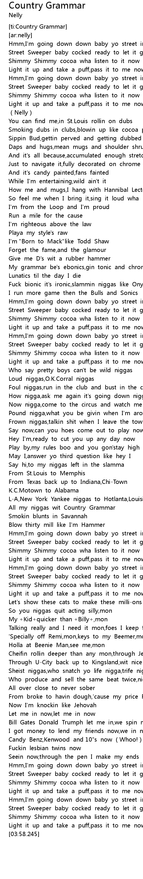 | [02:19.454] | All my niggas wit Country Grammar |