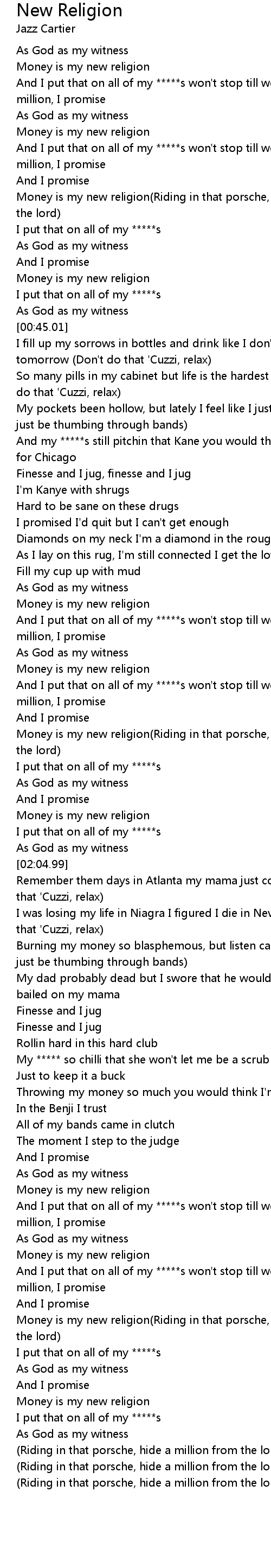 [03:09.67] Money is my new religion(Riding in that porsche, hide a million from the lord)