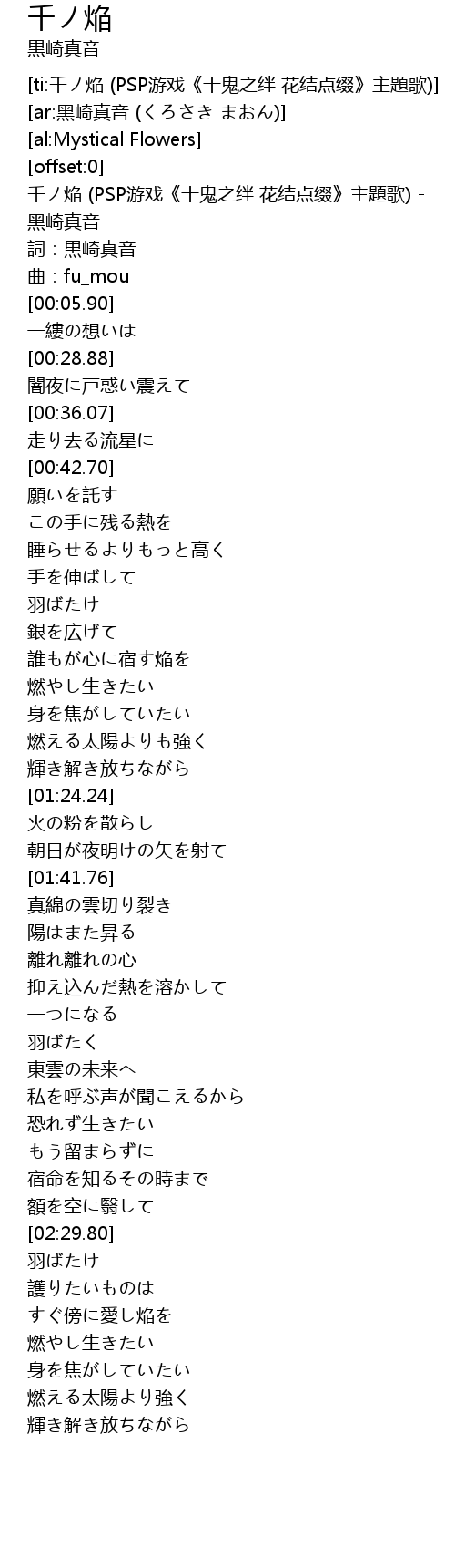 | [00:00.51] | 千ノ焔 (PSP游戏《十鬼之绊 花结点缀》主題歌) - 黑崎真音 |