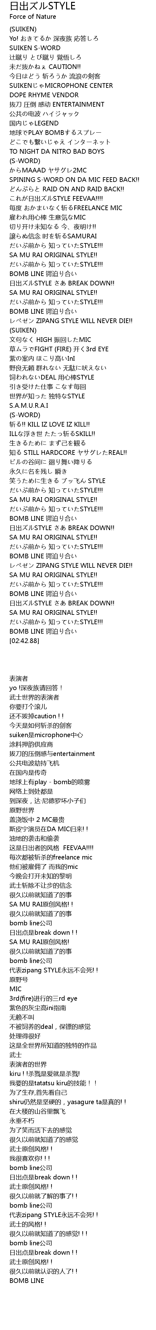 | [02:21.65] | レペゼン ZIPANG STYLE WILL NEVER DIE!! |