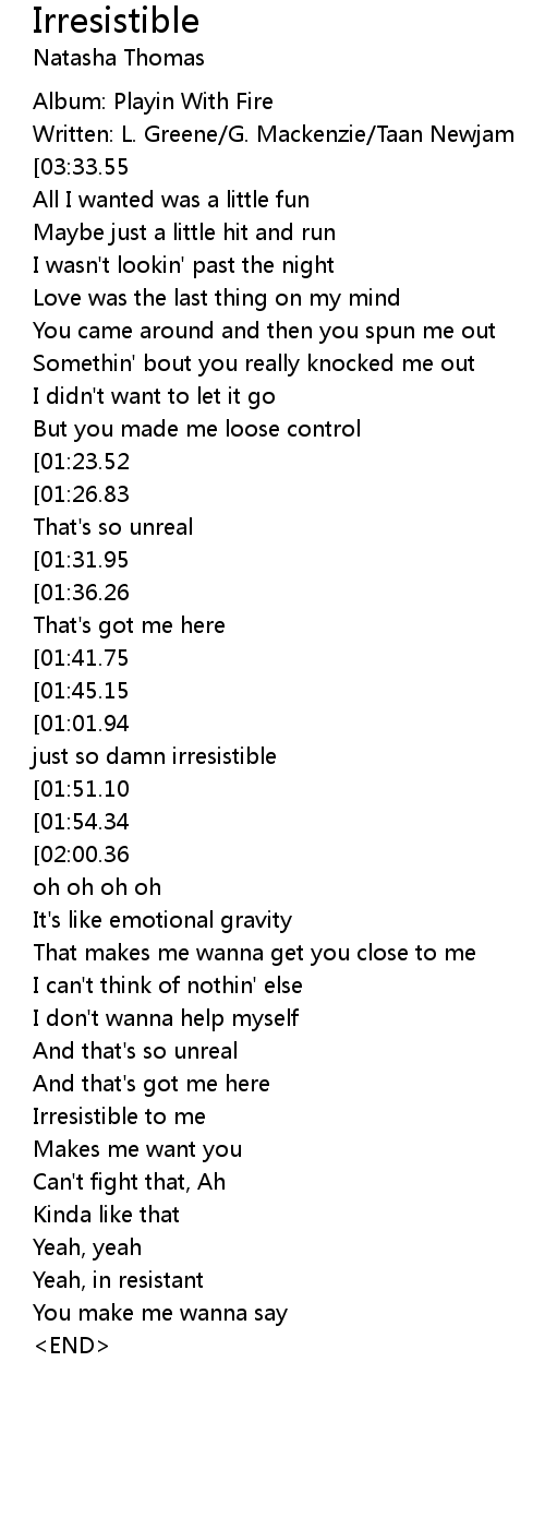 [00:52.89][01:01.94][01:11.19][01:48.19][01:57.13][02:06.20][02:15.51][02:43.12][02:52.31][03:01.41][03:10.66][03:28.94] You're just so damn irresistible
