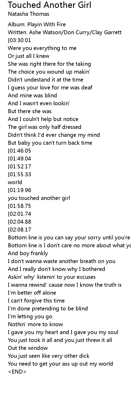 [01:07.22][01:19.96][01:58.26][02:10.94][02:49.12][03:01.88][03:14.65][03:27.35] Since you touched another girl