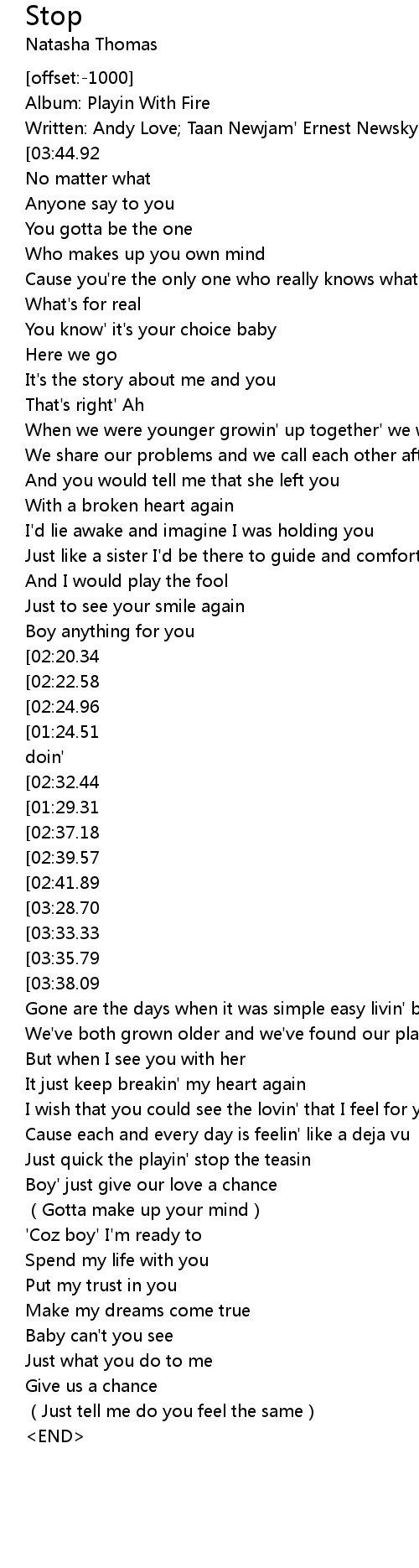 | [02:12.31] | Just quick the playin' stop the teasin |