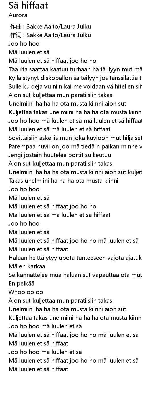 | [00:59.16] | Joo ho hoo m luulen et s m luulen et s hiffaat joo ho ho |
