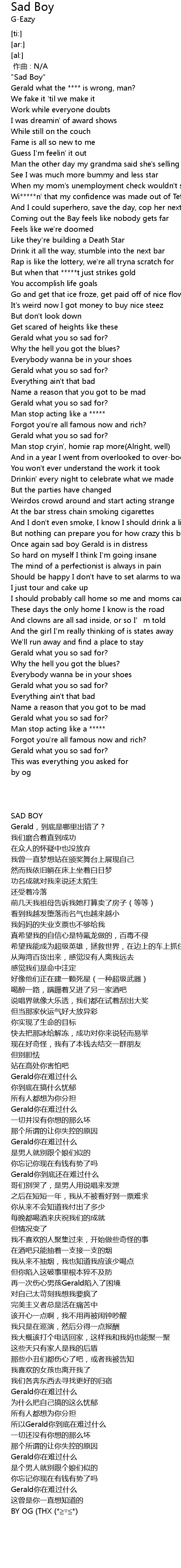 | [02:32.81] | Gerald what you so sad for? |