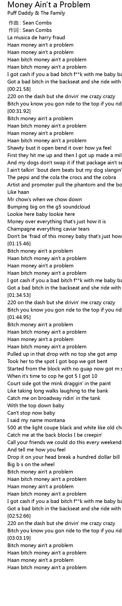 | [00:34.74] | Bitch money ain' t a problem |