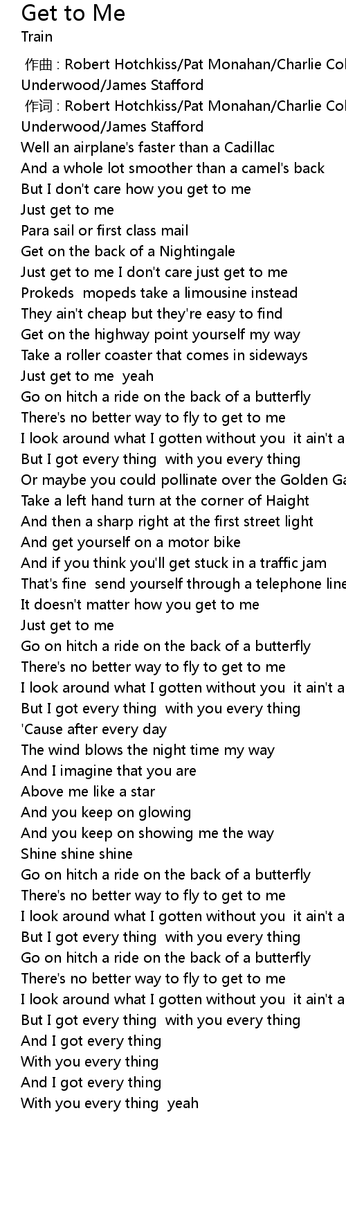 | [00:01.00] | 作词 : Robert Hotchkiss/Pat Monahan/Charlie Colin/Scott Underwood/James Stafford |