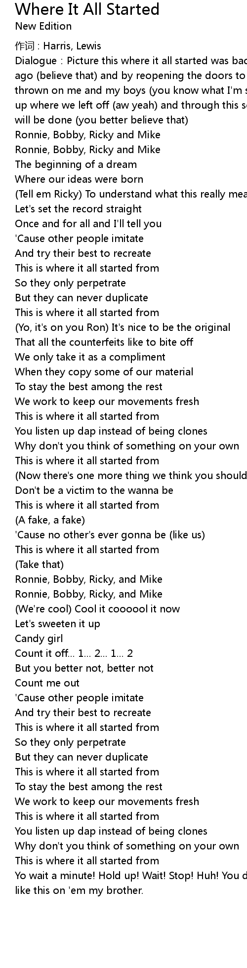 | Dialogue:Picture this where it all started was back in Boston, Mass. Some time ago (believe that) and by reopening the doors to all youth a little salt was thrown on me and my boys (you know what I'm sayin') but now we're back picking up where we left off (aw yeah) and through this song, process of elimination will be done (you better believe that) | |