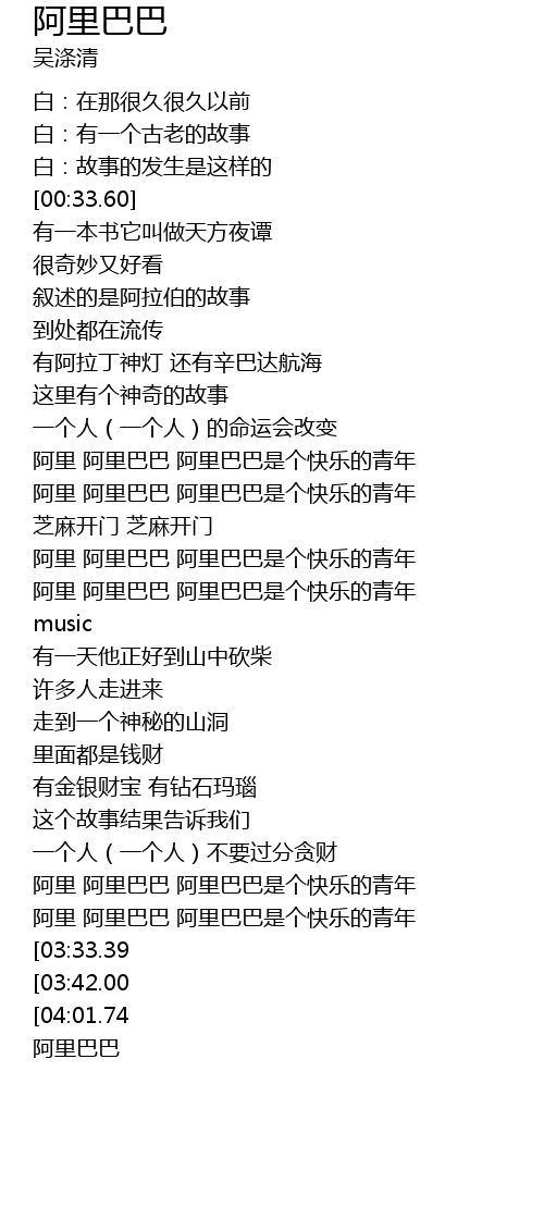 | [03:21.76] | 阿里 阿里巴巴 阿里巴巴是个快乐的青年 |