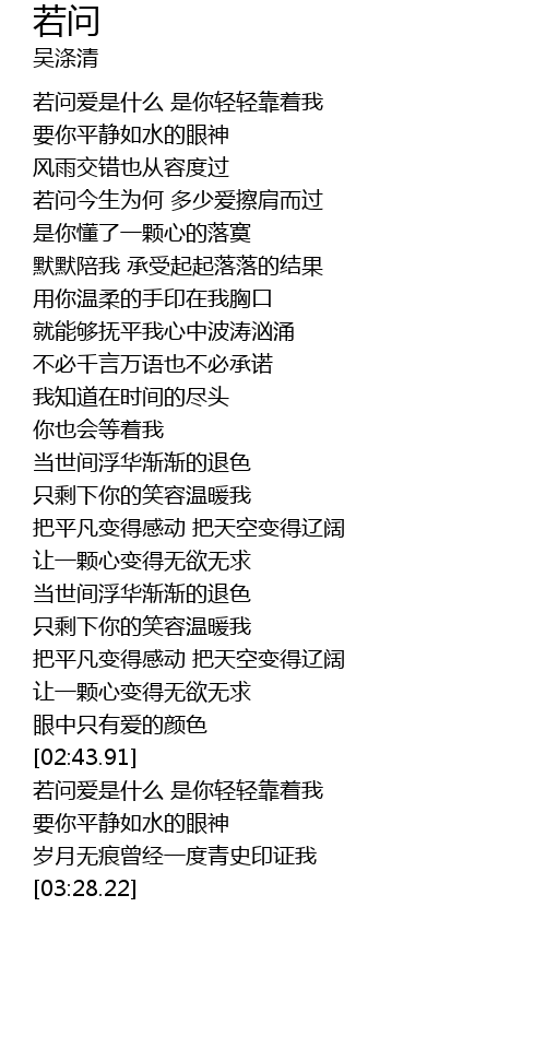 | [02:55.53] | 若问爱是什么 是你轻轻靠着我 |
