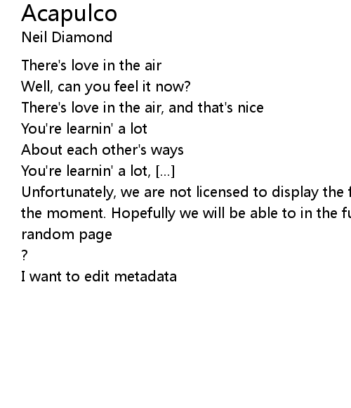 | Unfortunately, we are not licensed to display the full lyrics for this song at the moment. Hopefully we will be able to in the future. Until then, how about a | |