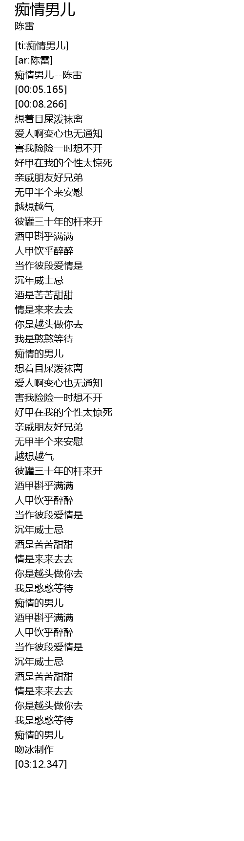 | [00:02.515] | 痴情男儿--陈雷 |
