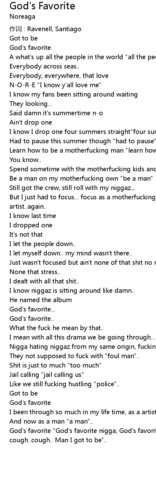 | God's favorite "God's favorite nigga, God's favorite..nigga, God's fav cough..cough.. Man I got to be".. |