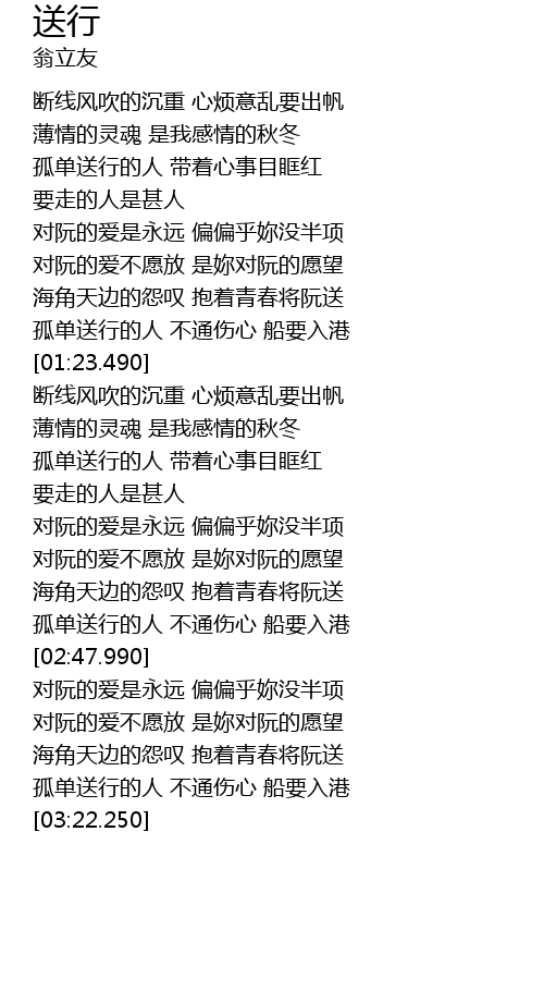 | [03:04.210] | 海角天边的怨叹 抱着青春将阮送 |