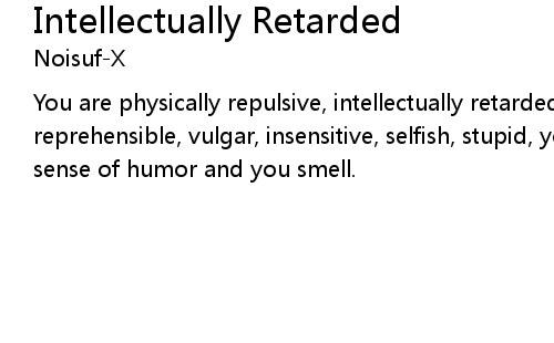| You are physically repulsive, intellectually retarded, you're morally reprehensible, vulgar, insensitive, selfish, stupid, you have no taste, a lousy sense of humor and you smell. |