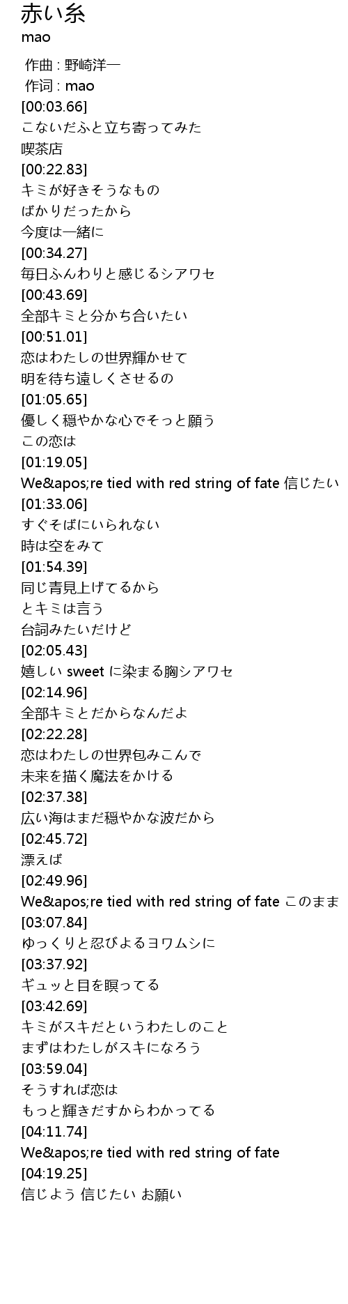| [01:20.95] | We're tied with red string of fate 信じたい |