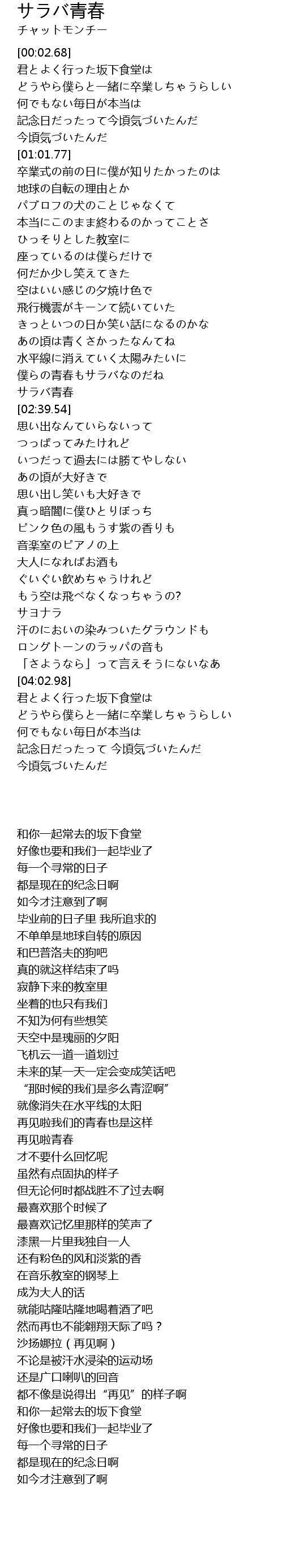 | [02:24.64] | 僕らの青春もサラバなのだね |