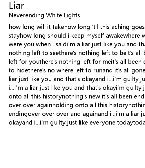 how long will it takehow long 'til this aching goes awayhow long should i stayhow long should i keep myself awakewhere were you were you in the endwhere were you when i saidi'm a liar just like you and that's okayi'm guiltythere's nothing left to seethere's nothing left to beit's all been donethere's nothing left for youthere's nothing left for meit's all been donethere's no where left to hidethere's no where left to runand it's all goneit's all goneand i...i'm a liar just like you and that's okayand i...i'm guilty just like everyone todayand i...i'm a liar just like you and that's okayi'm guilty just like everyoneholding onto all this historynothing's new it's all been endingover over over againover over over againholding onto all this historynothing's new it's all been endingover over over and againand i...i'm a liar just like you and that's okayand i...i'm guilty just like everyone todaytoday |