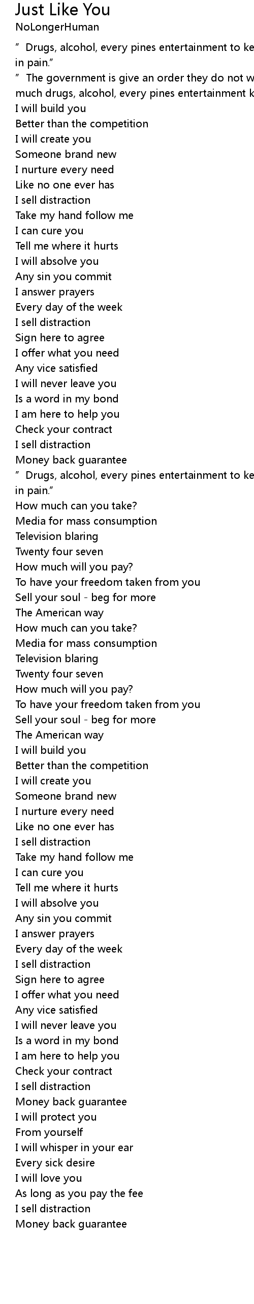 | [00:35.510] | " The government is give an order they do not want you to have to much drugs, alcohol, every pines entertainment keep the human mind in pain." |