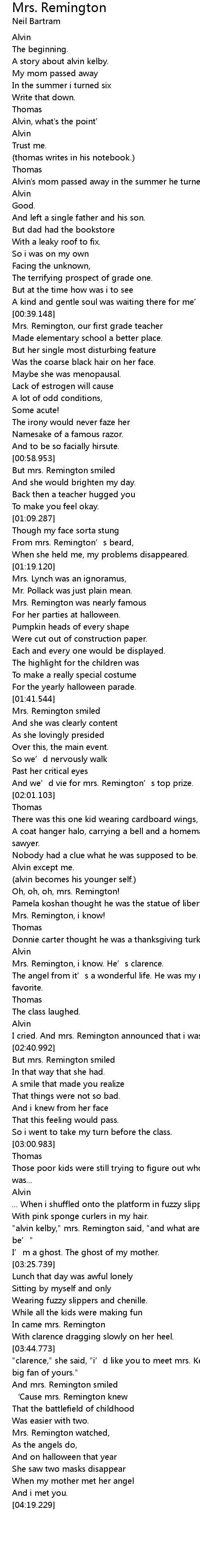 | [02:23.729] | Mrs. Remington, i know. He’s clarence. |