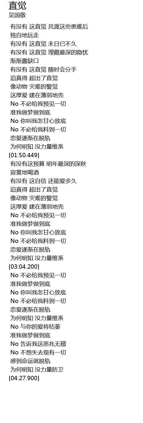 | [00:45.169] | 有没有 这直觉 末日已不久 |