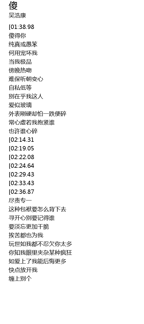| [00:17.33][01:38.98][03:16.44] | 吴浩康-傻(粤) |