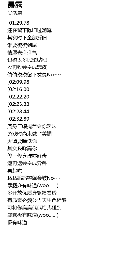 | [00:19.00][01:29.78][02:37.71][03:38.67] | 吴浩康-暴露(粤) |