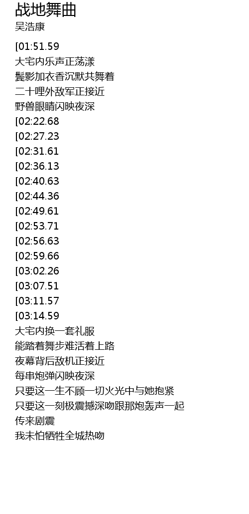 | [00:28.23][01:51.59][03:46.02] | 吴浩康-战地舞曲(粤) |