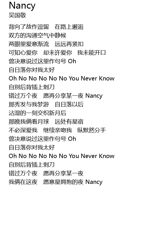 | [03:11.43] | wǒ liǎ zài zhè yè yuàn yì xīng yōng bào de yè Nancy |
