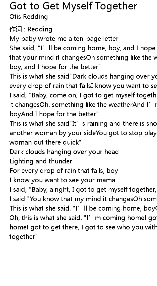 | I said, " Baby, come on, I got to get myself together' Cause you know my mind, it changesOh, something like the weatherAnd I' m going to be coming home, boyAnd I hope for the better" | |