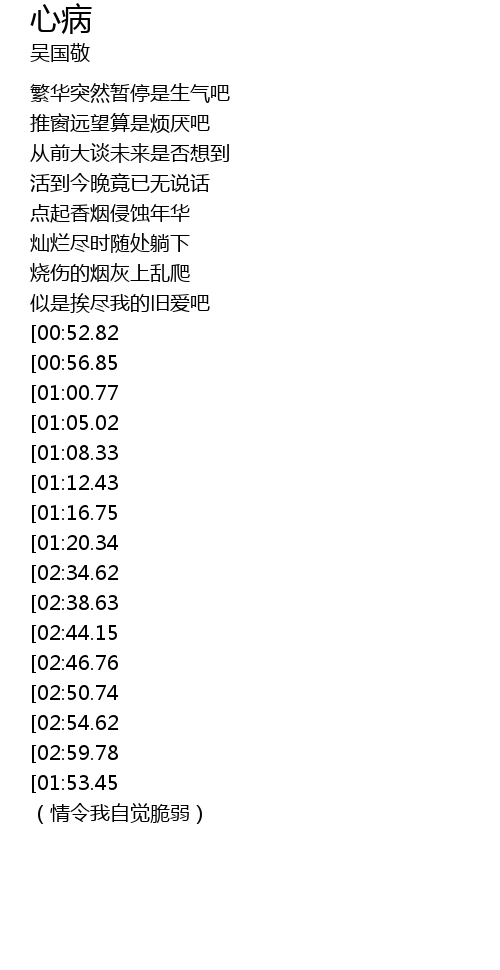 | [03:47.08][02:50.74][01:40.36] | shì zěn me sù chéng zhè xīn bìng |