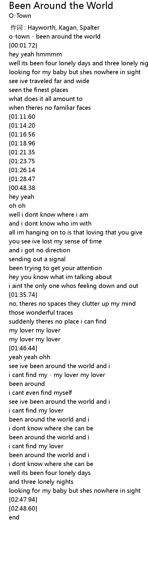 | [02:28.07][01:21.35][00:38.43] | been around the world and i |