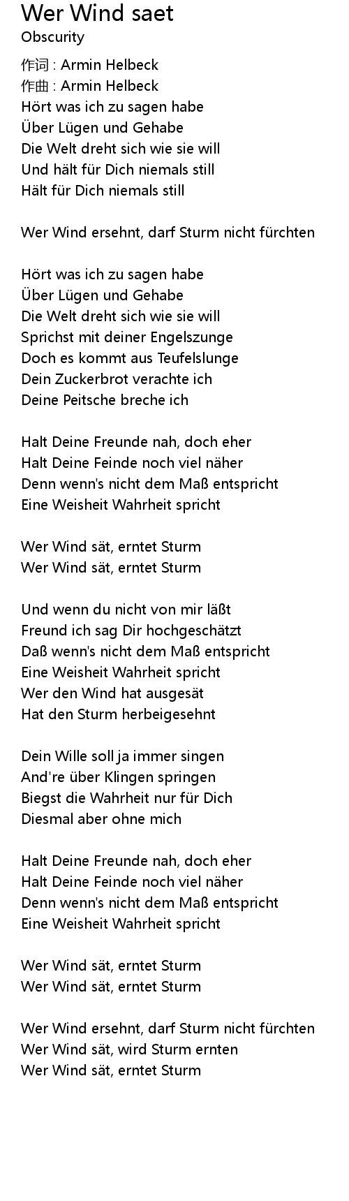 | Wer Wind s t, erntet Sturm | |