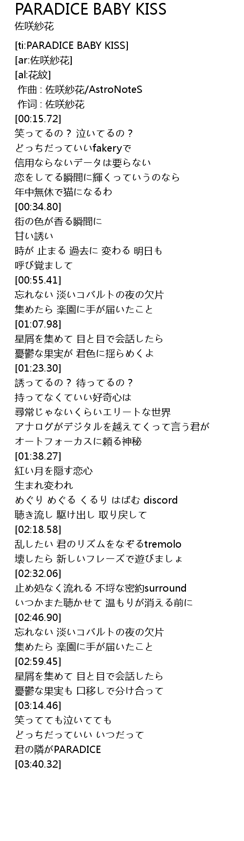 | [00:01.00] | 作词 : 佐咲紗花 |