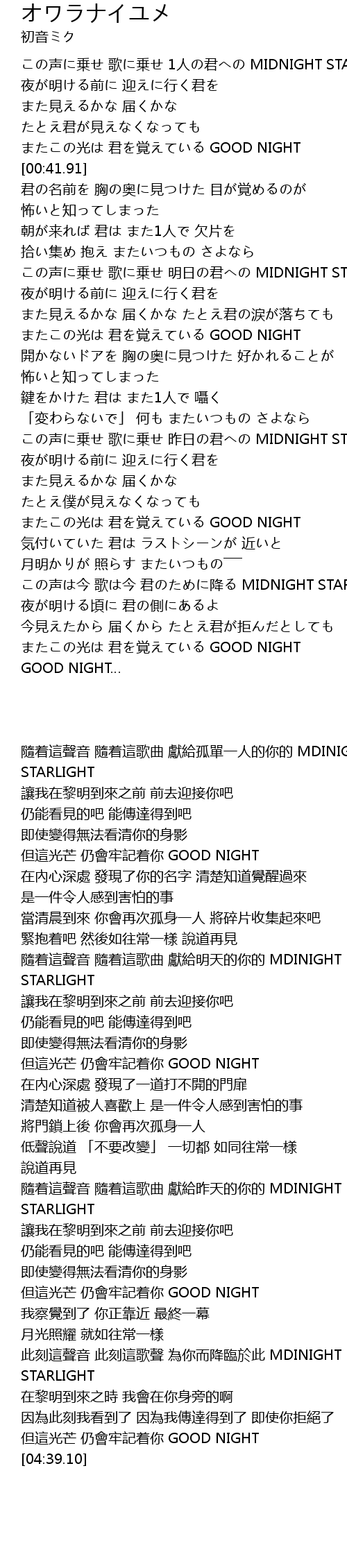 | [01:39.35] | sheng cheng ge cheng ming ri jun MIDNIGHT STARLIGHT |