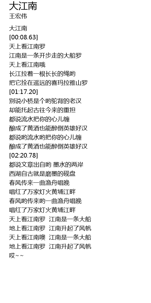 | [03:21.51] | 天上看江南罗 江南是一条大船 |