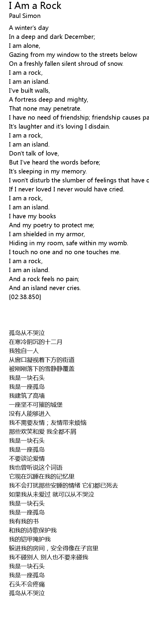 | [00:34.200] | I am an island. |