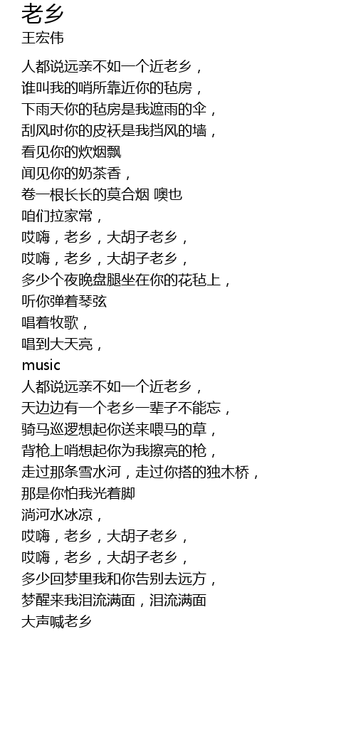 | [01:32.570] | 哎嗨,老乡,大胡子老乡, |