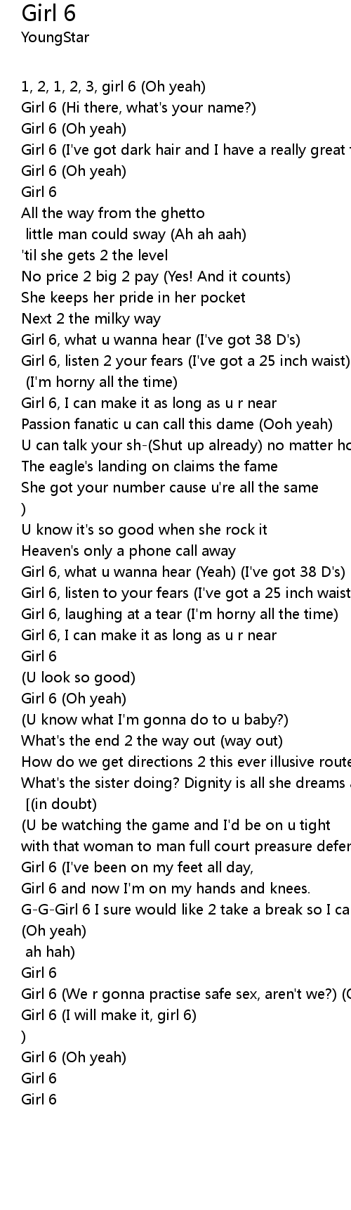 | Girl 6, what u wanna hear Yeah I' ve got 38 D' s | |