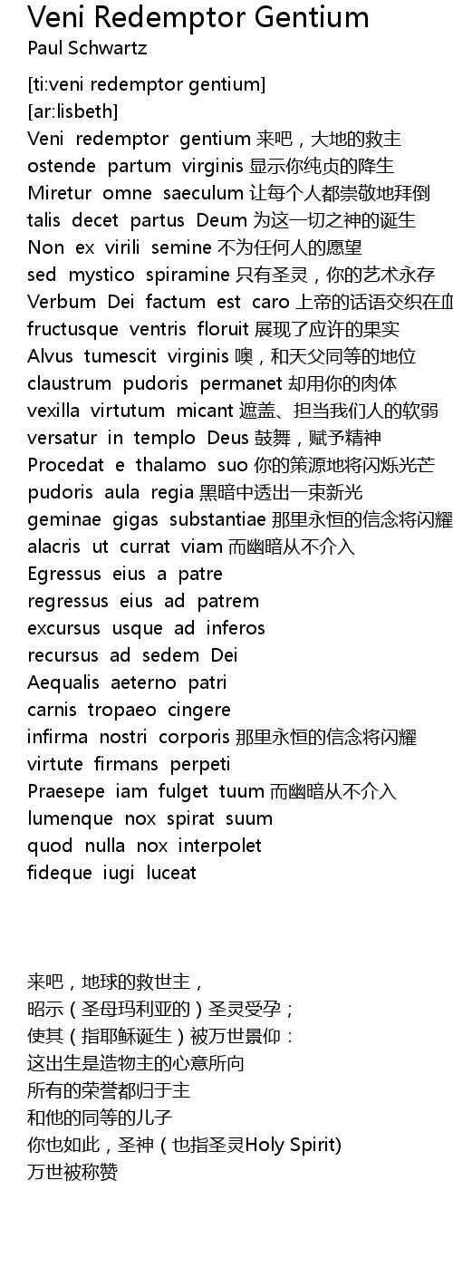 | [00:39.838] | Veni redemptor gentium 来吧,大地的救主 |